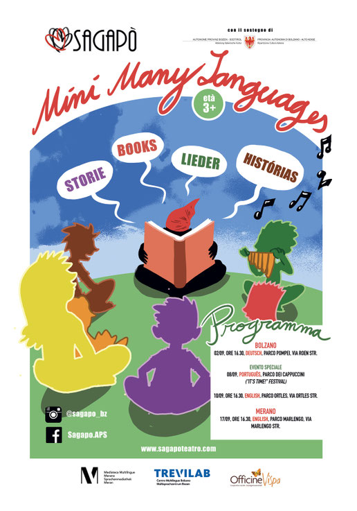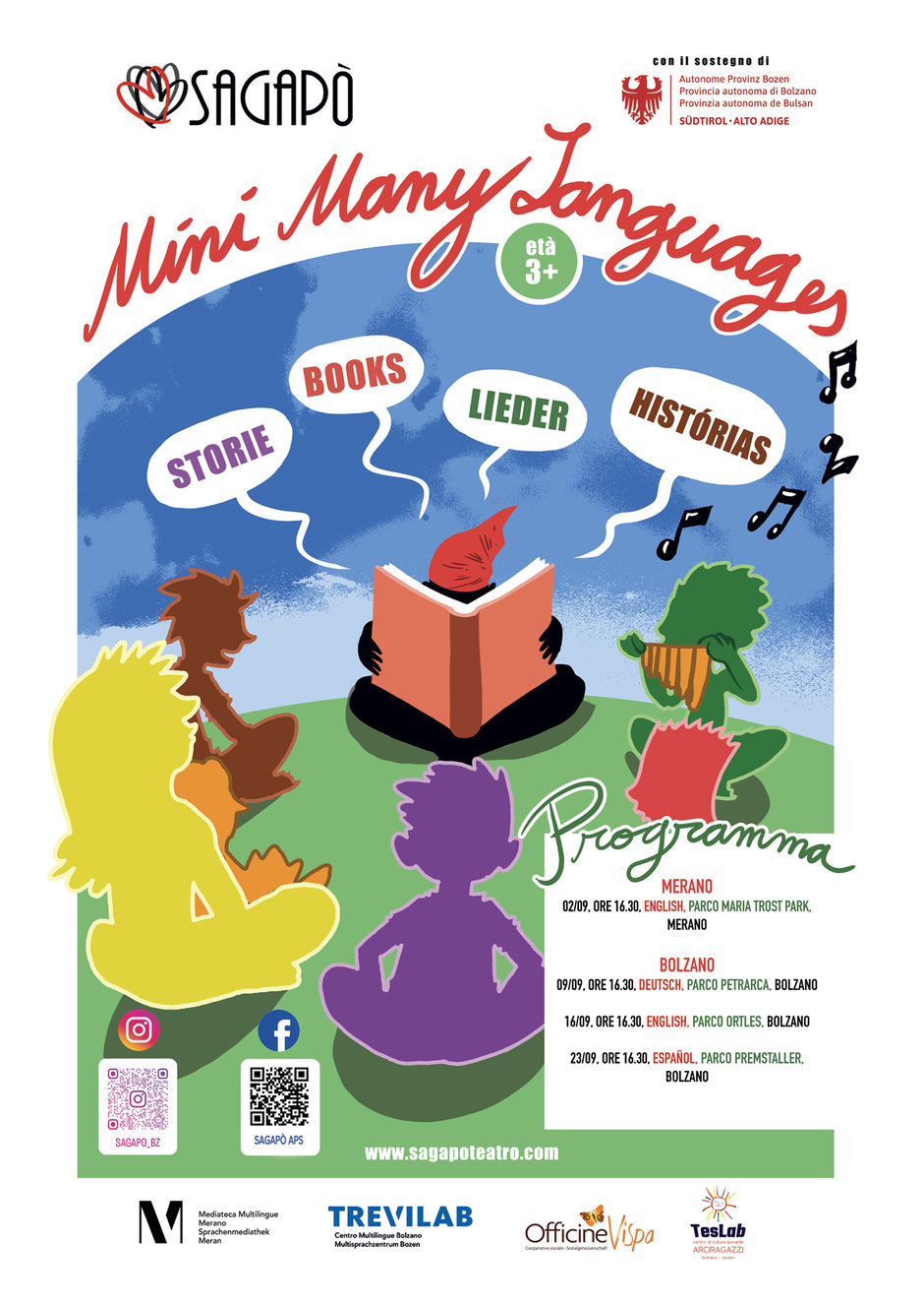 “Mini Many Languages” è un progetto di avvicinamento alle lingue organizzato dall’associazione culturale Sagapò con il contributo dell’Ufficio Bilinguismo e Lingue Straniere (Ripartizione Cultura Italiana) della Provincia Autonoma di Bolzano. Collaborano con Sagapò: Vivi Maso della Pieve, la cooperativa Officine Vispa e l’Associazione culturale Zaituna.