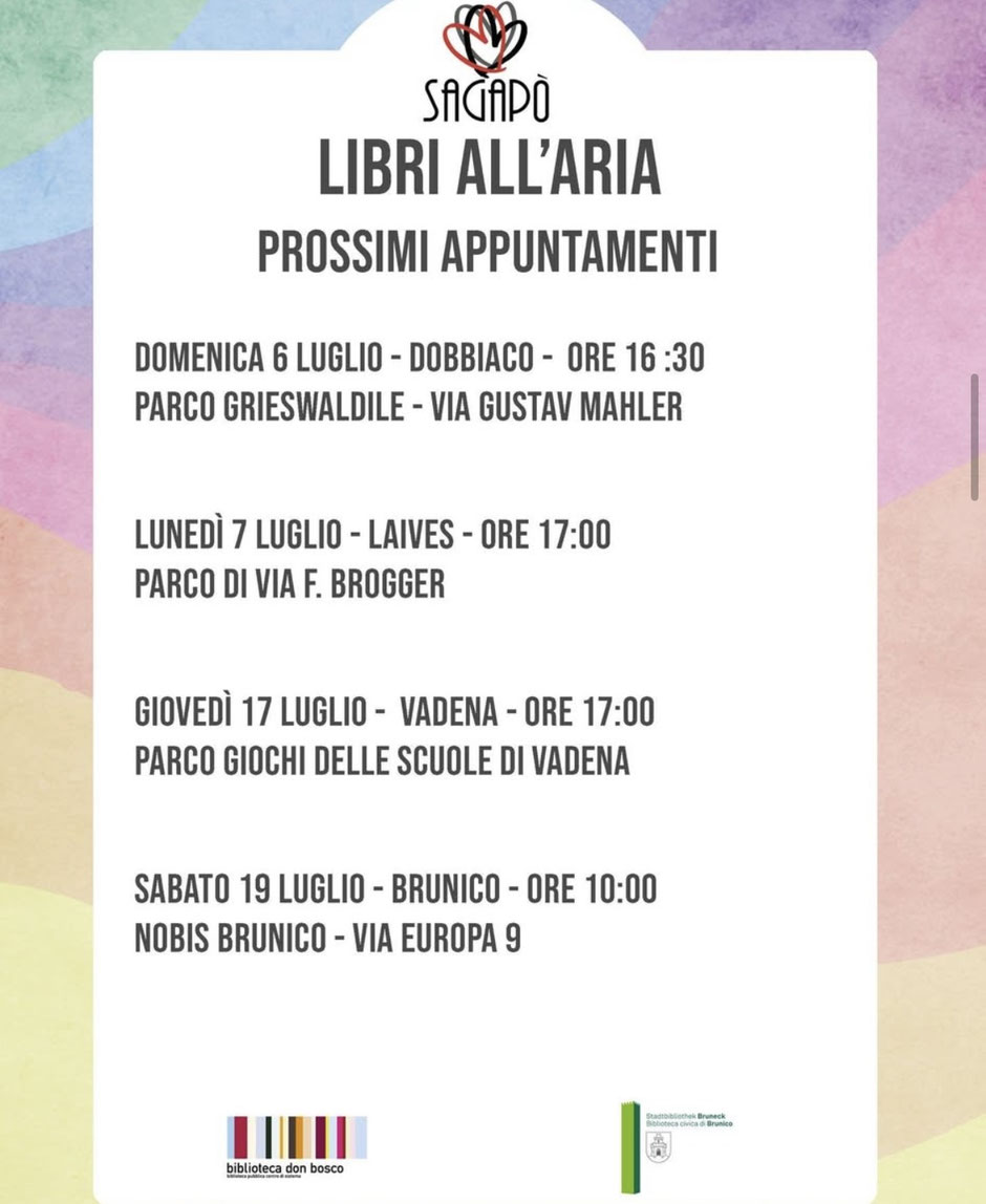 La rassegna ha avuto inizio con incontri all’aperto a maggio e giugno, rivolti ai bambini e alle loro famiglie: artisti professionisti hanno proposto filastrocche, albi illustrati e brevi storie in lingua, favorendo l’apprendimento attraverso il gioco e la narrazione. Il materiale bibliografico di questi incontri, e dei successivi incontri autunnali, è a disposizione della cittadinanza al Centro Multilingue di Bolzano e alla Mediateca Multilingue di Merano, partners del progetto.